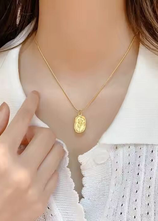 🌼 Mirror-bright pendant with raised tulip motif hangs from a silky flat chain—no stones, all glow.